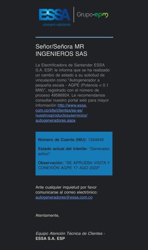 - Gestión exitosa ante la ESSA (del grupo EPM) en el Hub Central en el año 2022, para convertir a MR INGENIEROS SAS en generador activo, en la categoría de AGPE Autogenerador a pequeña escala <0.1 MW.